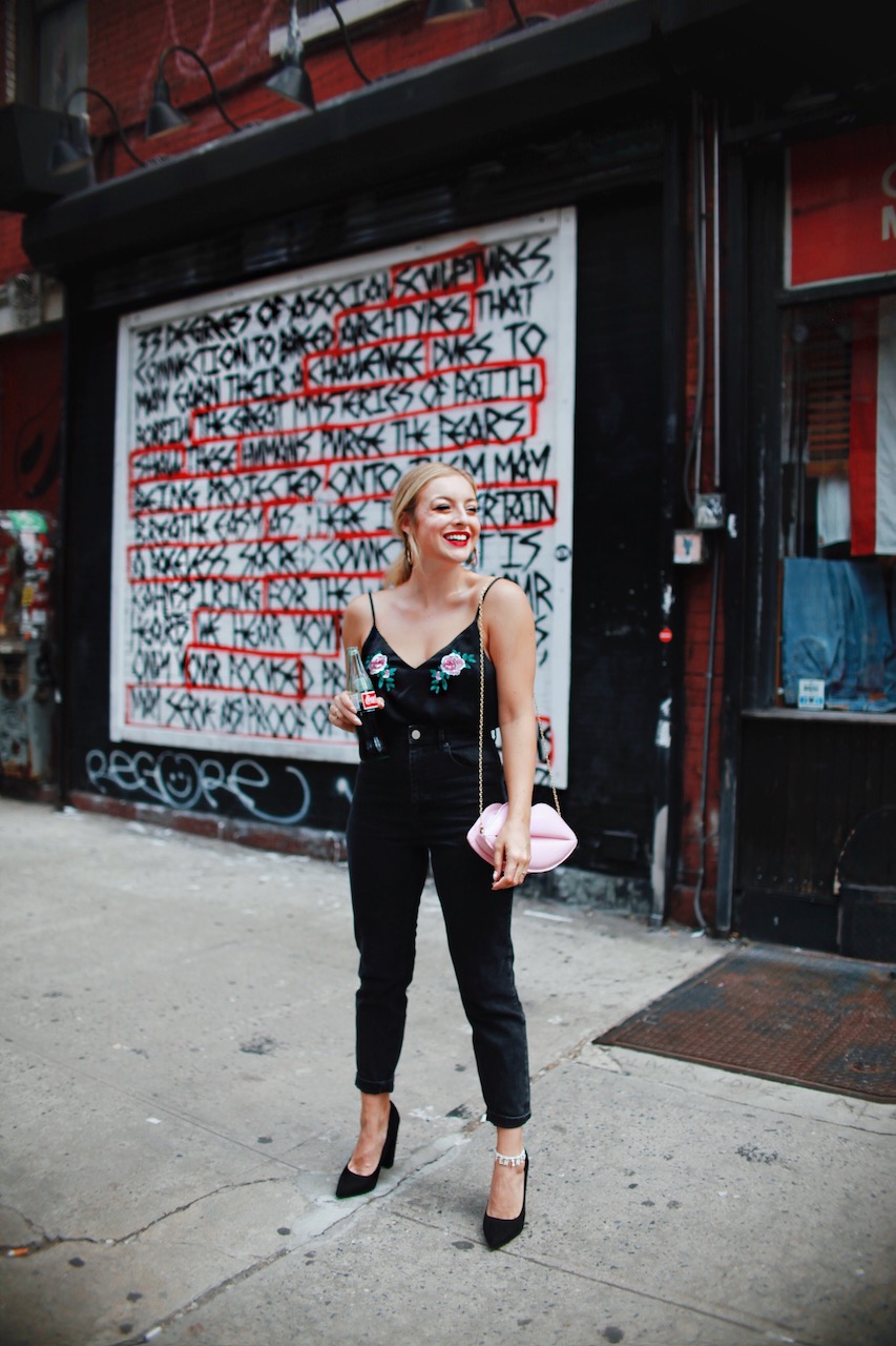 The key to “mom jeans” are paring them with a super feminine top to make them seem dressier than they are.